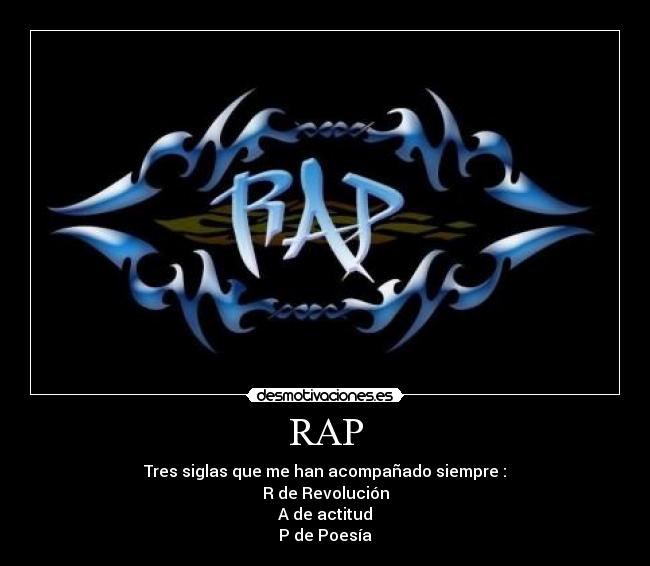 El rap es un tipo de sprechgesang (recitación rítmica de rimas y juegos de palabras) surgido a mediados de la década de los 80 entre la comunidadafroamericana de los Estados Unidos. En la cultura hip hop es uno de los cuatro pilares fundamentales, llamado metonímicamente (y de forma imprecisa) hip hop. Aunque puede interpretarse a capella, el rap va normalmente acompañado por una “base”, un fondo musical rítmico también conocido con la voz inglesa beat. Los intérpretes de rap son conocidos como MC, "Maestros de Ceremonias". Se ha aplicado elretroacrónimo RAP, de rhythm and poetry (ritmo y poesía).